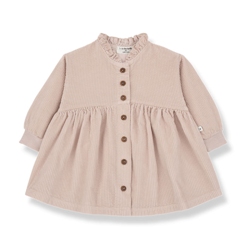 Bellissimo abito per bambina di 1+ in the family, realizzato in velluto a coste, morbido e delicato sulla pelle dei bambini. Questo vestito a manica lunga, ha una trama a costine color nude, e dei graziosi bottoncini in legno davanti. Un abito bello e grintoso, perfetto per l'autunno-inverno.
