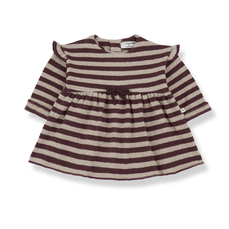 Bellissimo abito per bambina di 1+ in the family, realizzato in caldo cotone, morbido e delicato sulla pelle dei bambini. Questo vestito a manica lunga, ha una trama a righe color melanzana, e un grazioso fiocco davanti e dei bottoncini in legno nella parte posteriore. Un abito bello e grintoso, perfetto per l'autunno-inverno.