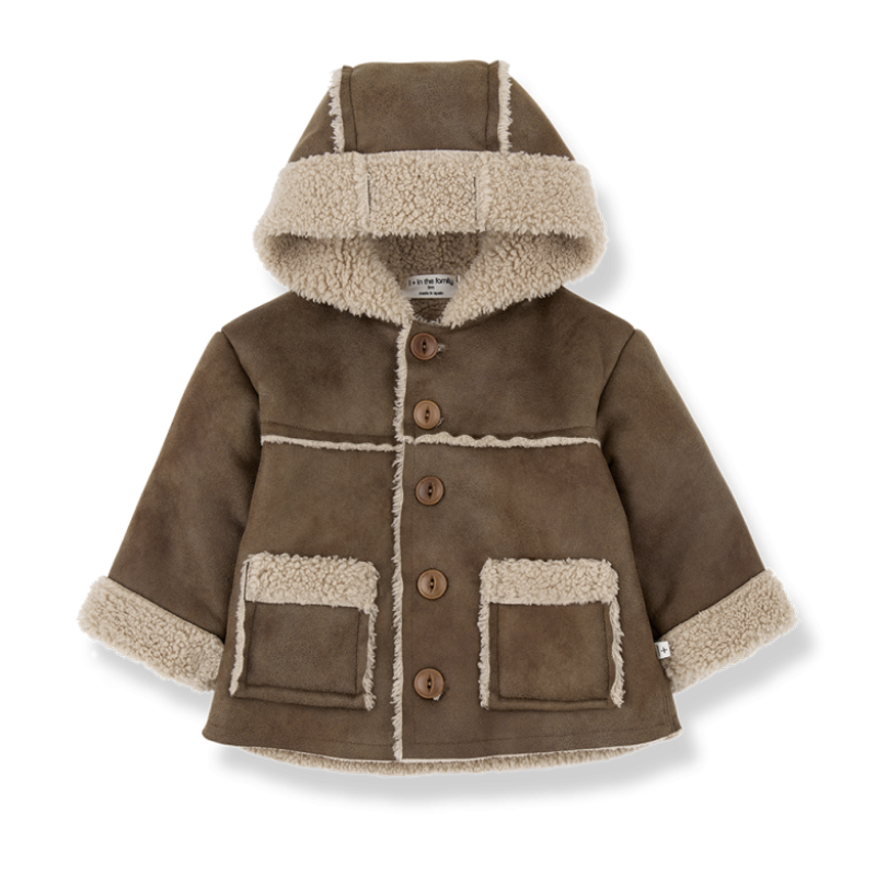 Un bellissimo cappotto da bambini di 1+ in the Family, in eco montone, un morbido tessuto che terrà al caldo i vostri bimbi nelle giornate più fredde. Questo cappotto color marrone con inserti e imbuttitura in eco pelliccia, presenta un'apertura frontale con bottoni in legno. Perfetto per l'autunno-inverno!