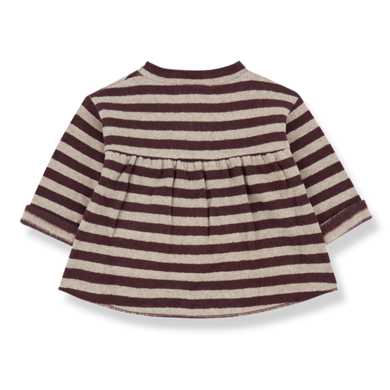 Bellissima felpa per bambini, di 1+ in the family, realizzata in caldo cotone riciclato, morbida e delicata sulla pelle dei bambini. Questa felpa righe beige e melanzana, maniche con risvoltini. È una felpa davvero pratica e con una vestibilità comoda, perfetta per l'autunno-inverno!