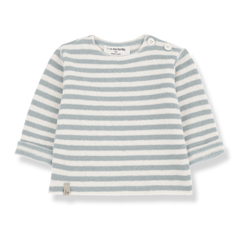 Una bellissima maglia per bambino, di 1+ in the Family, morbida e delicata sulla pelle dei bambini. Questa maglietta a righe color nuvola ha dei risvoltini nelle maniche. Una magliettina perfetta per l'autunno-inverno.