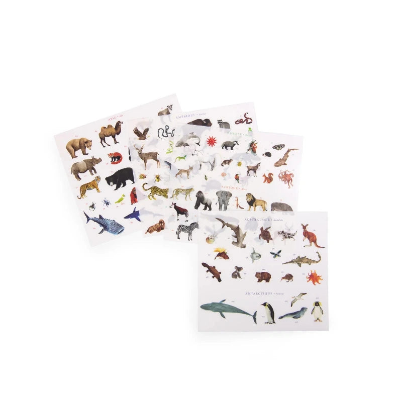In quali continenti vivono questi animali? Utilizzando i 4 fogli trasferibili e il poster riporta i 107 animali nel loro habitat naturale sulla mappa del mondo. Strofina con una matita per vedere l'animale apparire sulla mappa!