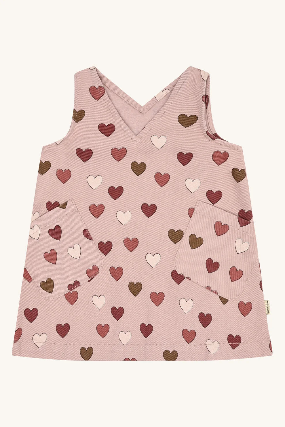 Grazioso abito per bambina realizzato in caldo cotone biologico, un tessuto morbido, confortevole e di alta qualità. Questo vestito smanicato ha una stampa di graziosi cuoricini con tasconi applicati sul davanti. Perfetto per l'autunno-inverno!