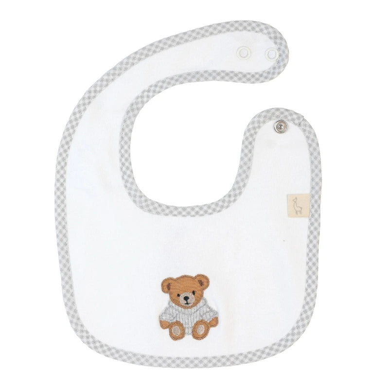 Bellissimo bavaglino per neonati realizzato in 100% cotone. Questo bavaglinosi coordina perfettamente con tutto il set teddy grigio. Adatto per i primi mesi di vita e da inserire nel corredino del vostro bambino. Perfetto per la stagione autunno-inverno.