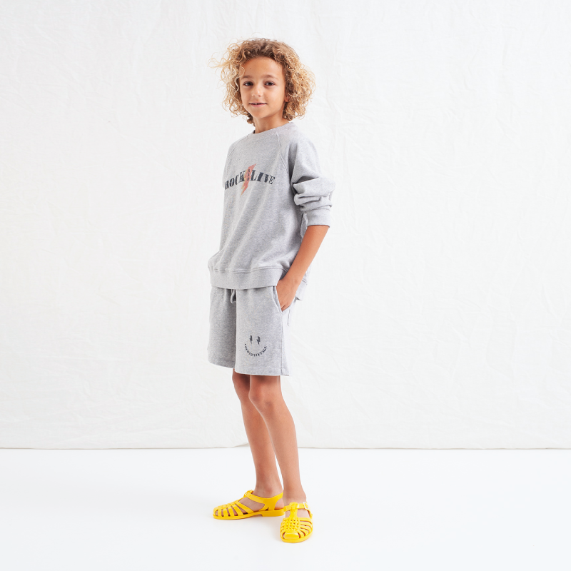 Bellissimo pantaloncino per bambini stile bermuda in felpa di cotone biologico. Questo pantaloncino in tonalità grigio è elastico in vita, con stampa frontale.