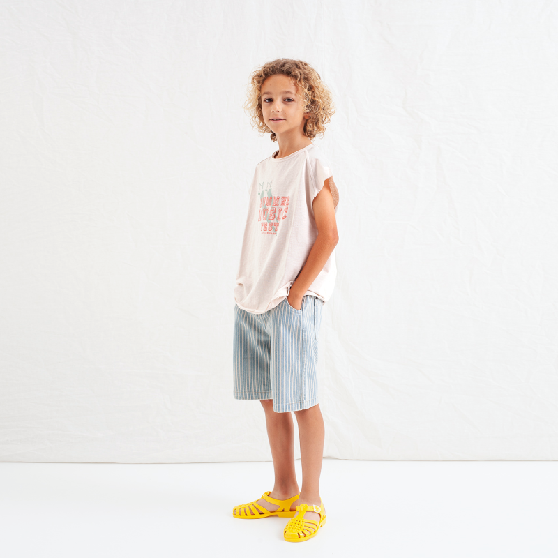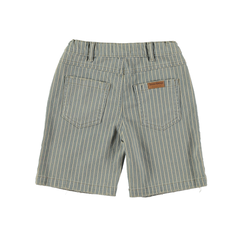Bellissimo bermuda in jeans per bambini, lungo fino al ginocchio, stampato a righe blu con effetto washing. Il pantaloncino ha 5 tasche e chiusura con cerniera e bottone. Passanti per la cintura.