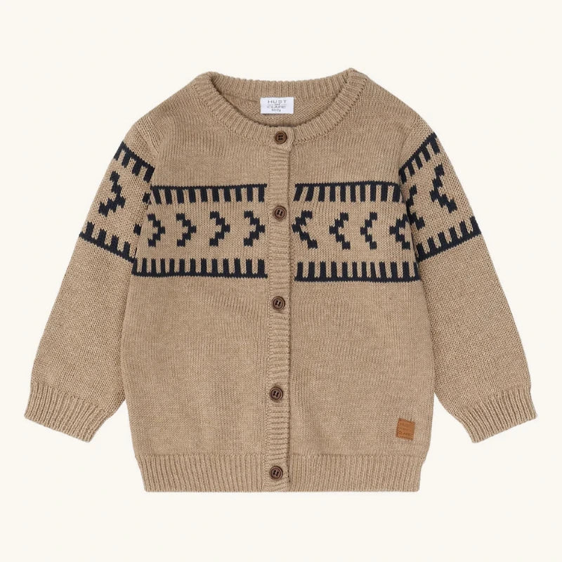 Bellissimo cardigan per bambini in caldo cotone biologico, un tessuto morbido, confortevole, di ottima qualità. Questo cardigan è in tonalità beige con motivi geometrici blu. Perfetto per la stagione autunno-inverno!
