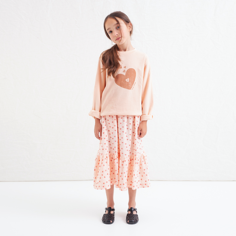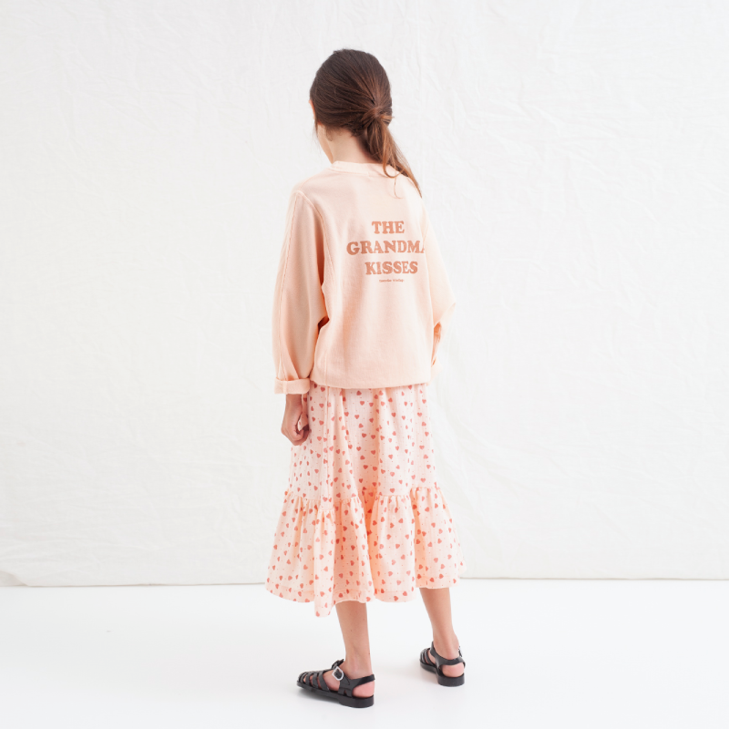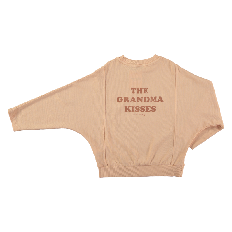 Felpa per bambina oversize con l'immagine di un cuore sul davanti e la scritta "The Grandma Kisses" sul retro, fondo rosa antico. Scollo tondo con finiture a costine. Questa felpina è in 100% cotone biologico.