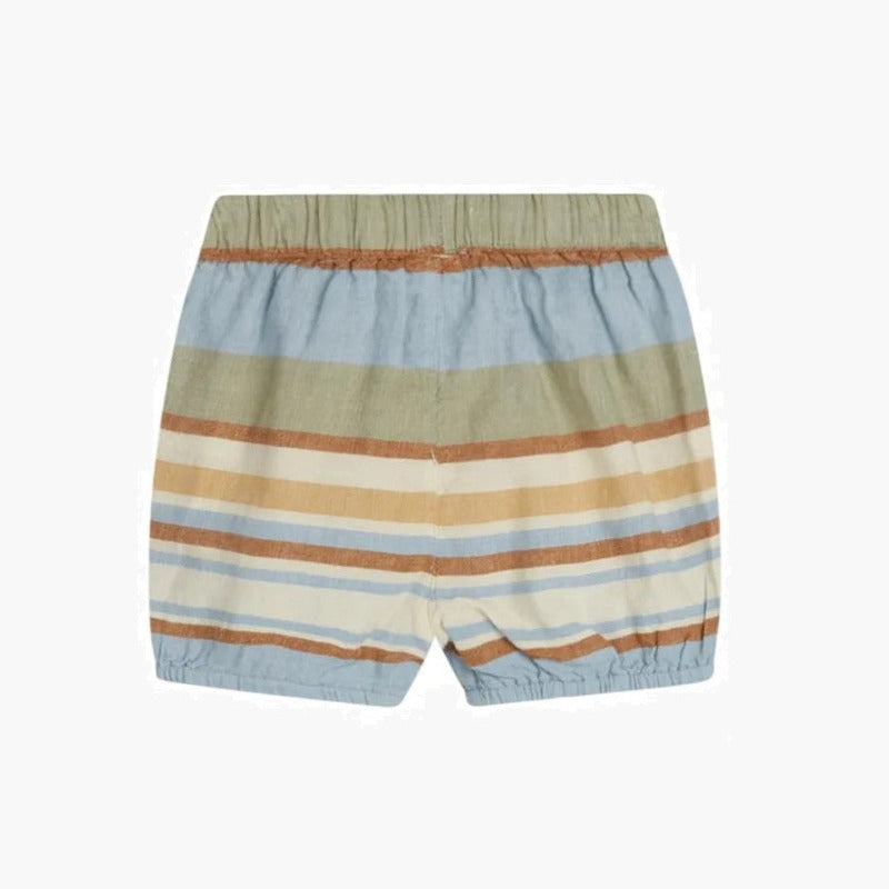 Il bermuda di Hust & Claire è realizzato in un mix di cotone e lino, morbido e di alta qualità, per regalare ai tuoi bambini il massimo comfort. Traspirante e leggero, questo pantaloncino a righe orizzontali multicolor, renderà felice il tuo bambino. Elastico sui polsini e in vita con chiusura a coulisse.