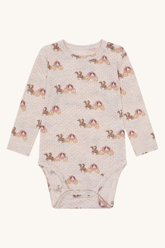 Bellissimo body con carrozze in lana e tencel, morbido e di alta qualità, per regalare alla tua bambina il massimo comfort. Il body è in tessuto leggero a manica lunga elasticizzato, apertura frontale e sulla parte bassa tramite bottoni.