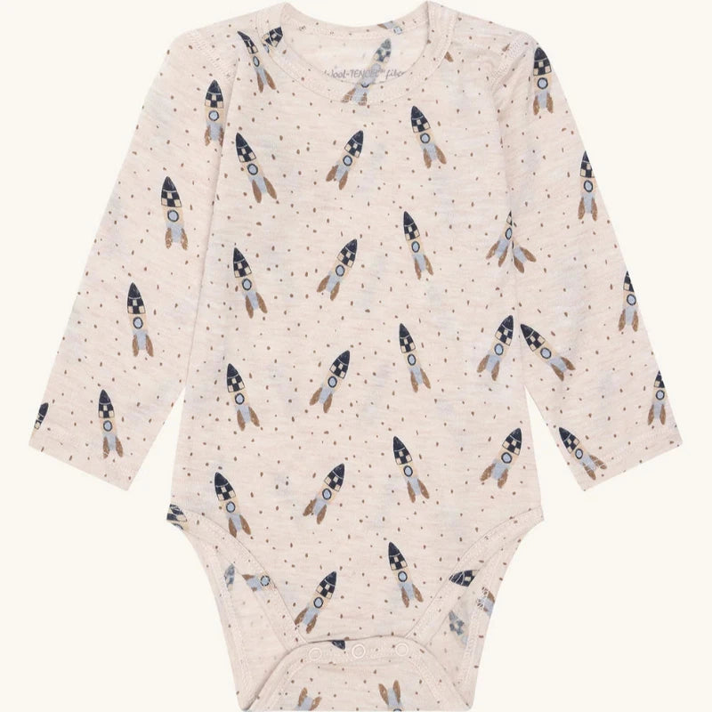 Bellissimo body con razzi in lana e tencel, morbido e di alta qualità, per regalare al tuo bambino il massimo comfort. Il body è in tessuto leggero a manica lunga elasticizzato, apertura frontale e sulla parte bassa tramite bottoni.