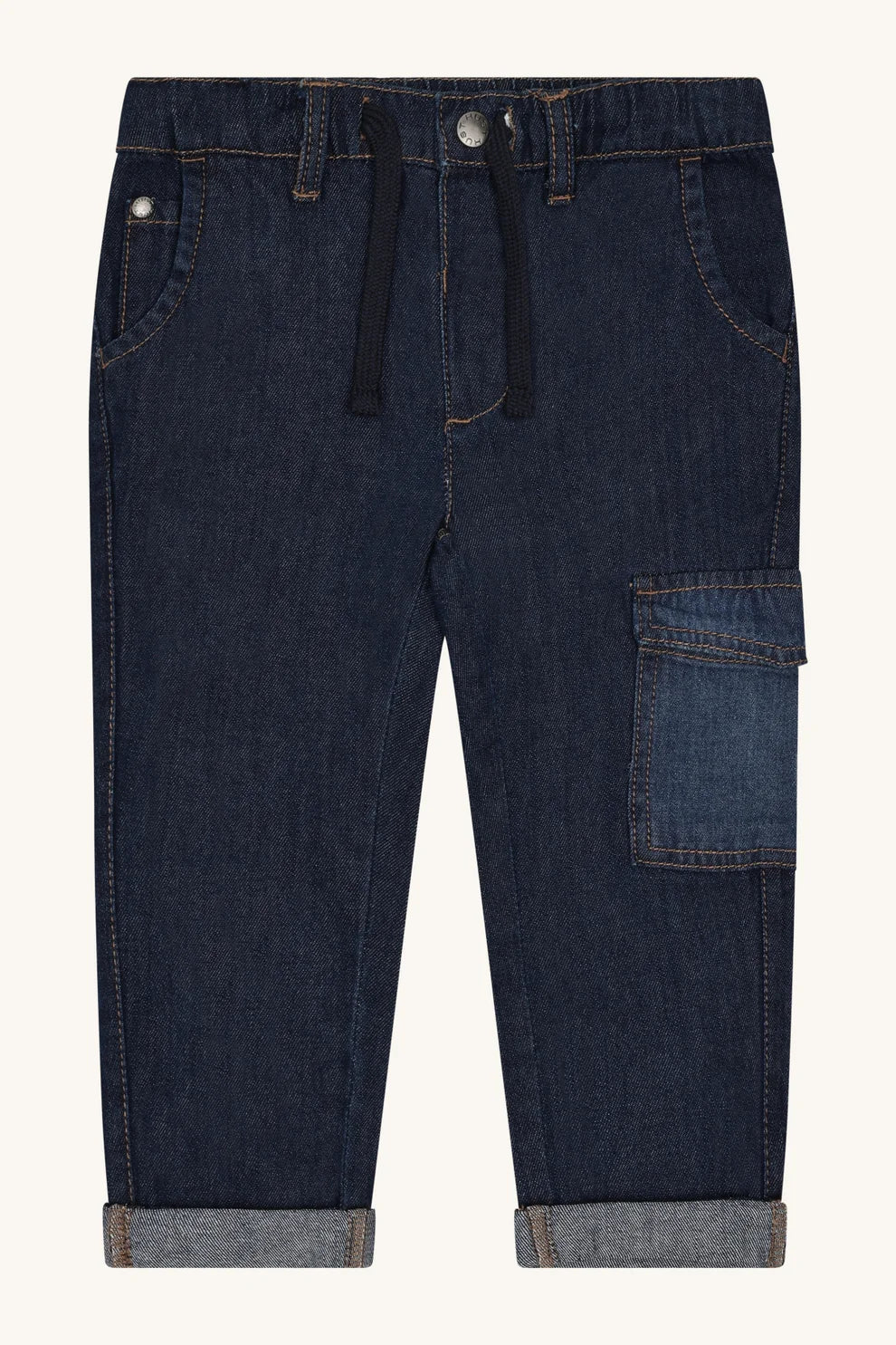 Bellissimo pantalone elasticizzato per bambino in color denim, con vita elastica, E' dotato di tasche anteriori e posteriori e una tasca cucita sulla gamba sinistra del pantalone. Perfetto per la stagione autunno-inverno!